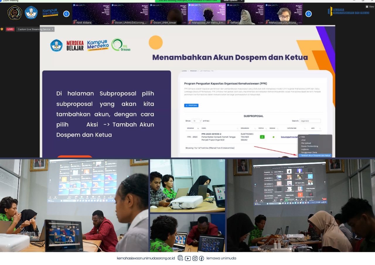 Rabu, 21 Juni 2023 Lembaga kemahasiswaan dan alumni Universitas Pendidikan Muhammadiya (UNIMUDA) Sorong menyelenggarakan Bimbingan Teknis bagi Dosen pendamping PKM dan PPK ORMAWA, dari perwakilan kelompok Program Kreatifitas Mahasiswa PKM dan PPK ORMAWA yang lolos pendanaan.